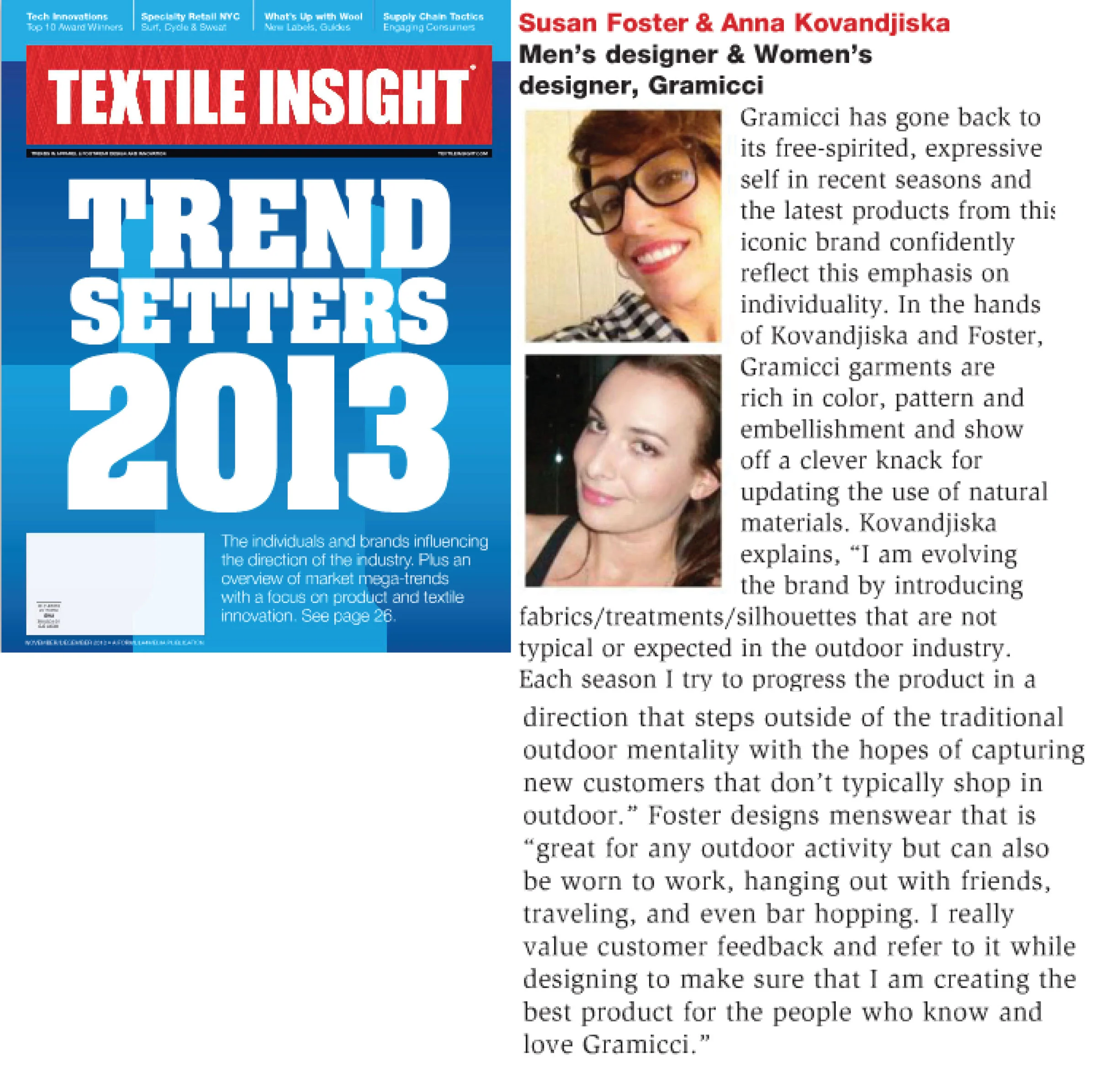 At Gramicci, in an area of the business that experienced constant flip-flopping of ideas, Susan forged through to consistently create innovative and "saleable" designs. She ensured the brand messaging was communicated through the fabric choice, treatments and styles of the collection she was solely entrusted in developing.